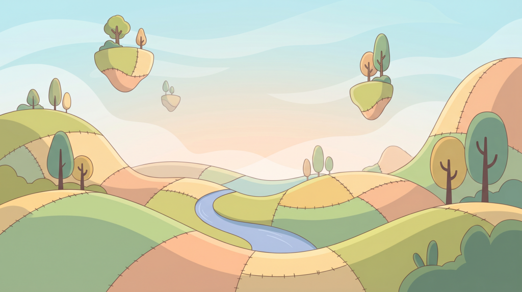 The Patchwork Wild is a soft, stitched together world where forests meet floating islands, rivers curve like ribbons, and the landscape shifts in quiet, surprising ways.
